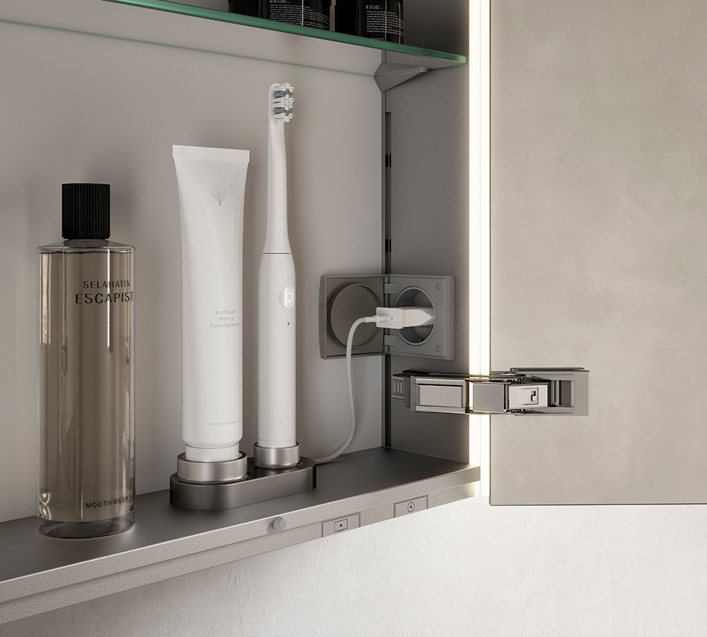 Im reduzierten Look des Korpus verbirgt sich das großzügige Innenleben. Dies beinhaltet viel Stauraum und praktische Details erleichtern den Alltag. Die Glasböden können so angeordnet werden, wie sie für die großen und kleinen Pflegeprodukte benötigt werden. Eine seitlich angebrachte Steckdose ermöglicht das Laden der Zahnbürste im Spiegelschrank. Sie ist mit einem Klappdeckel geschützt und kommt zum Vorschein, wenn sie gebraucht wird. Soft-close Scharniere sorgen für leises und sanftes Schließen der Türen, auch wenn diese mal schwungvoll geschlossen werden. Dank beidseitig verspiegelter Türen kann man sich auch von hinten betrachten.